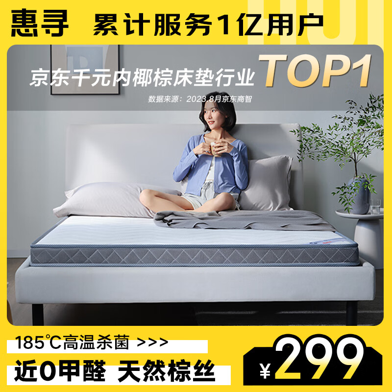 惠寻 京东自有品牌 椰棕床垫硬棕垫薄床垫偏硬无胶水 1*2米10cm厚价格:299.00元!