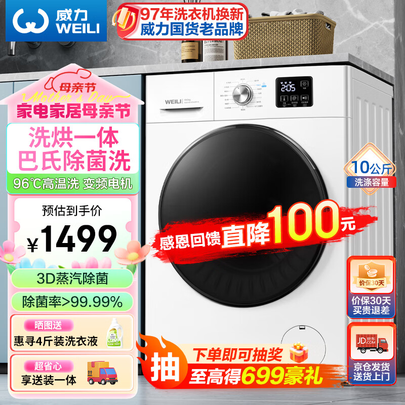 威力(WEILI)滚筒洗衣机全自动 10KG洗烘一体 超薄变频一级 巴氏除菌洗 高温筒自洁 以旧换新 XQG100-1016DPHX价格:1499.00元!