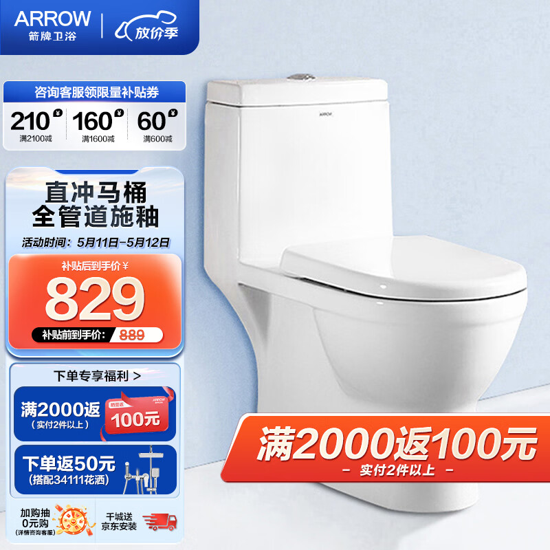 箭牌(ARROW)马桶家用直冲式坐便器大冲力座便坐厕 1级水效 全管施釉AEB12601M价格:979.00元!