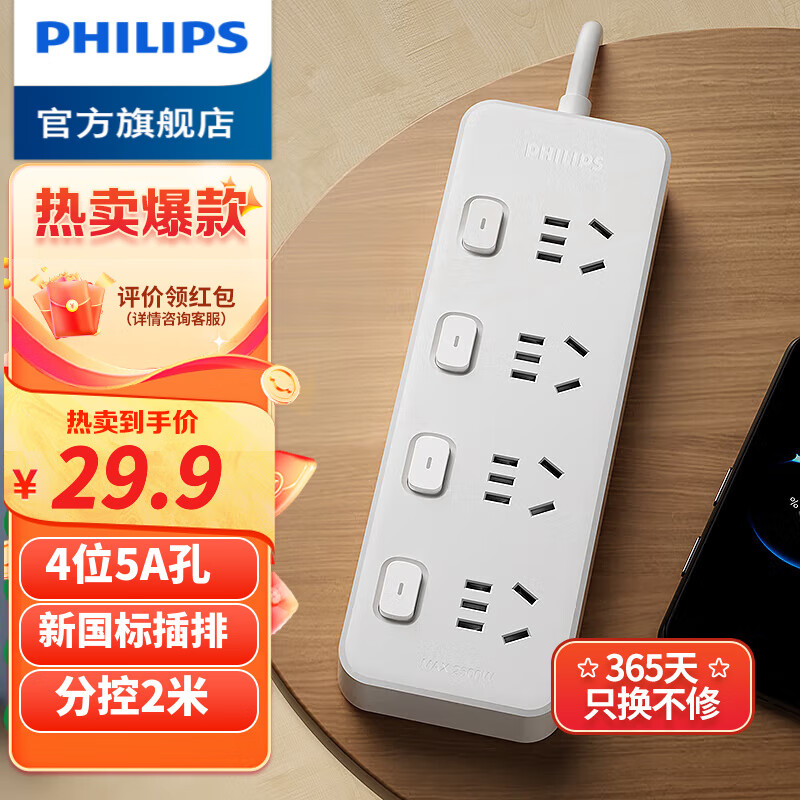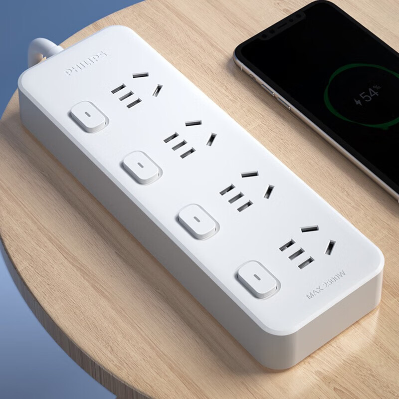 飞利浦(PHILIPS)插座插排 新国标分控排插 接线板 拖板插座 插线板3米 2米 1.8米 分控4位2米【新国标】价格:29.90元!