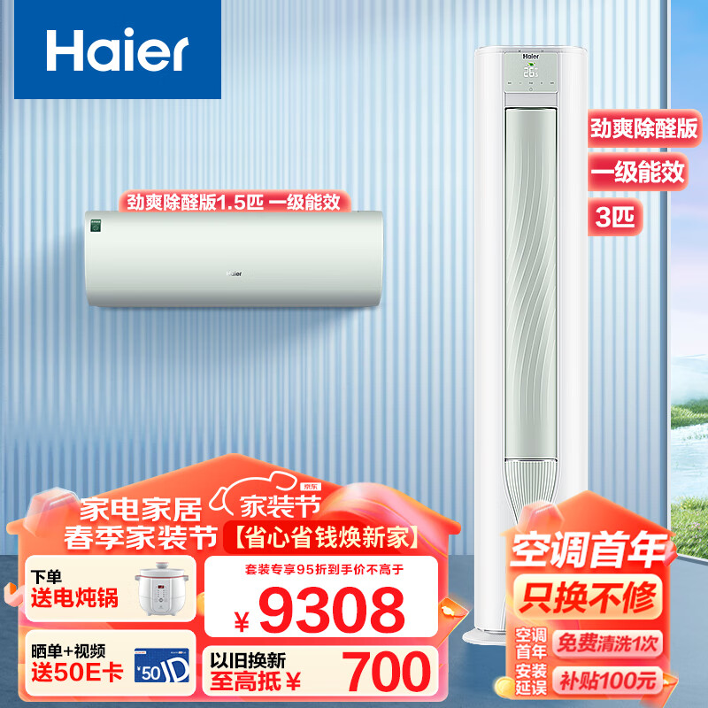 海尔(Haier)劲爽除醛版 新一级能效变频节能 冷暖柜挂机 (1.5匹+3匹)一室一厅空调套装 以旧换新价格:9308.00元!