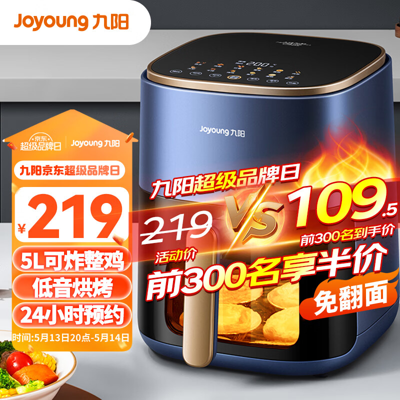 九阳(Joyoung)不用翻面 聚能寰顶 可视智能 远红外烘烤不用翻面空气炸锅 家用5L大容量 薯条机电炸锅 KL50-V552价格:239.00元!