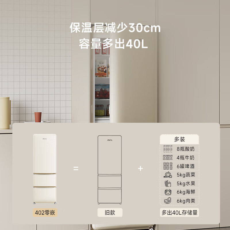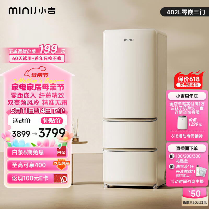 小吉(MINIJ)【保价618】402L零嵌双变频风冷无霜一级能效超薄嵌入式三门客厅冰箱干湿分储变温低噪BCD-JY402W价格:3899.00元!