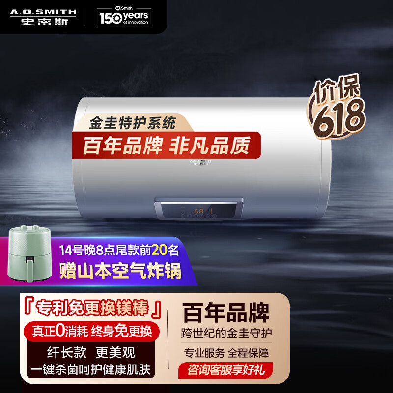 史密斯(A.O.SMITH)60升电热水器 专利免更换镁棒 金圭内胆 速热节能 纤美长款 大屏E60VC0 一级能效价格:2358.00元!