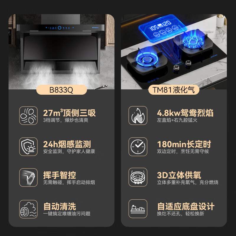 森太(SETIR)抽油烟机烟灶套装 顶侧双吸家用大吸力油烟机灶具套装 鸳鸯焰定时液化气灶 B833Q+TM81价格:1899.00元!