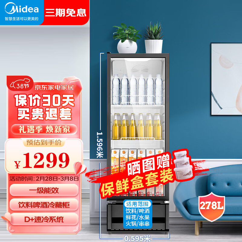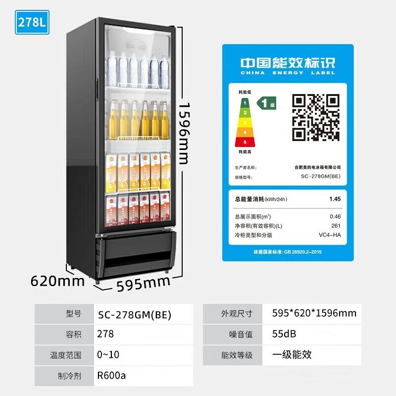 美的商用展示柜 立式冷藏保鲜饮料啤酒柜 便利店冰柜 278升玻璃门冰柜SC-278GM(EB) 黑色一级能效价格:1359.00元!