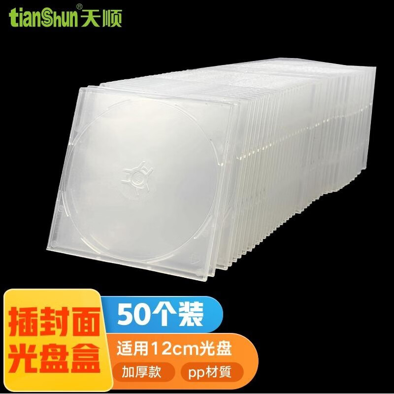 天顺光盘盒加厚款胶质透明光盘盒纸制光盘袋/pp光盘包收纳整理盒半圆光盘贴收纳盒 单面方形塑料光盘盒50个装可插封面价格:68.00元!