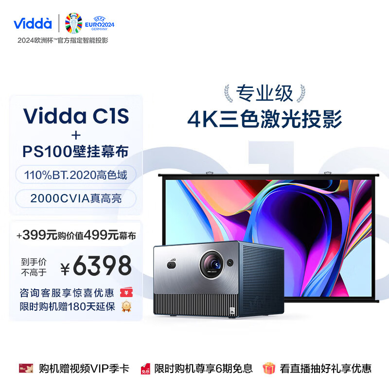 Vidda C1S 海信 4K超高清纯三色激光 投影仪家用家庭影院卧室白天投墙((含100英寸投影壁挂幕布)价格:6397.00元!