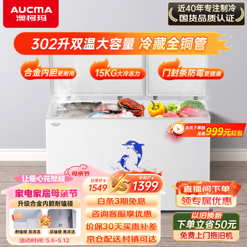 澳柯玛(AUCMA)302升 冰柜家用双温双箱商用家用大容量冰柜卧式冰柜囤货冷柜冷藏全铜管BCD-302CNE以旧换新价格:1449.00元!