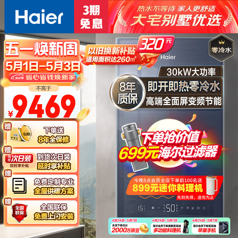 海尔(Haier)增压零冷水燃气壁挂炉天然气采暖炉热水器家用板换式地暖暖气片锅炉变频风机L1PB30-JR3(T)U1价格:9469.00元!