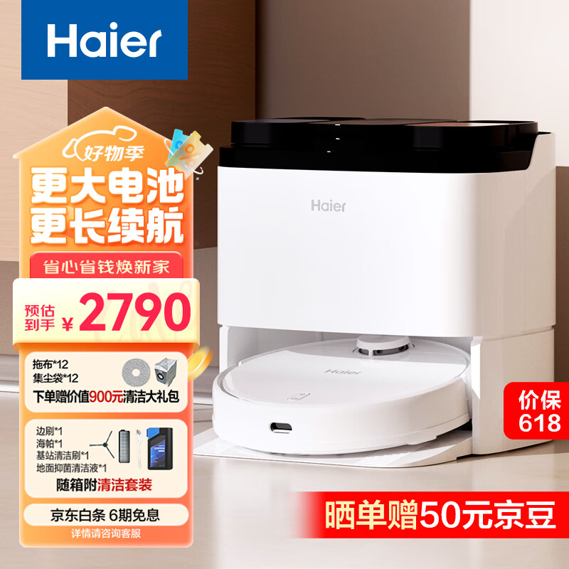 海尔Haier小金刚扫地机器人 扫拖一体自清洁自动集尘 免洗拖布拖地机吸 电解水杀菌热风烘干H11 MAX价格:3090.00元!