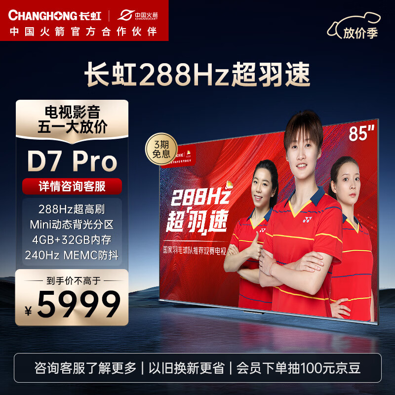 长虹电视85D7 PRO 85英寸288Hz游戏电视 Mini动态背光 高色域 MEMC 4K智能平板液晶LED电视机以旧换新价格:5999.00元!