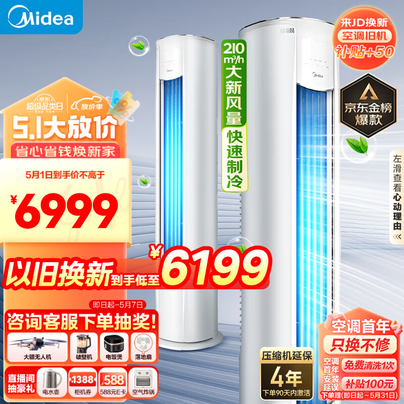 美的(Midea)2匹新风空调新风量210m3/h焕新风新一级变频冷暖客厅立式柜机KFR-51LW/N8MKA1A价格:6999.00元!