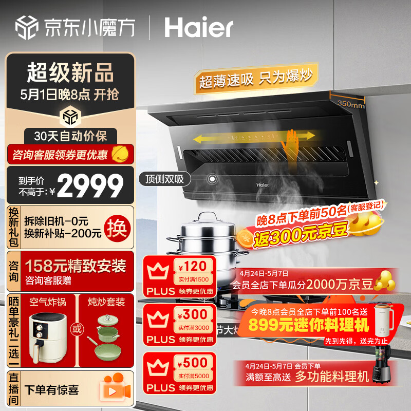 海尔(Haier)抽油烟机 顶侧双吸烟灶套装 24m3/min大吸力 家用顶吸式厨房吸油烟机燃气灶具套装C51+Q7BE3天价格:2999.00元!