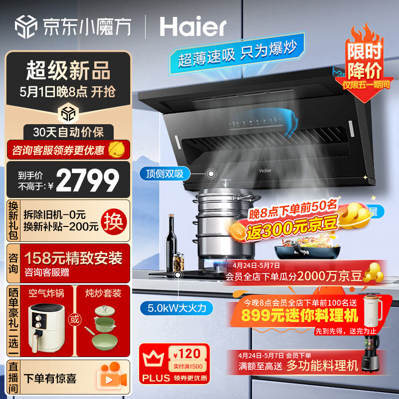 海尔(Haier)抽油烟机 顶侧双吸烟灶套装 变频25m3/min大吸力 5.0kw家用厨房吸油烟机燃气灶具套装C61+Q2BE2天价格:2799.00元!
