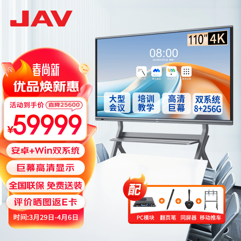 JAV会议平板一体机智能远程视频会议系统手写投屏电子白板演示屏触摸显示屏多媒体教学110英寸科技版价格:59999.00元!