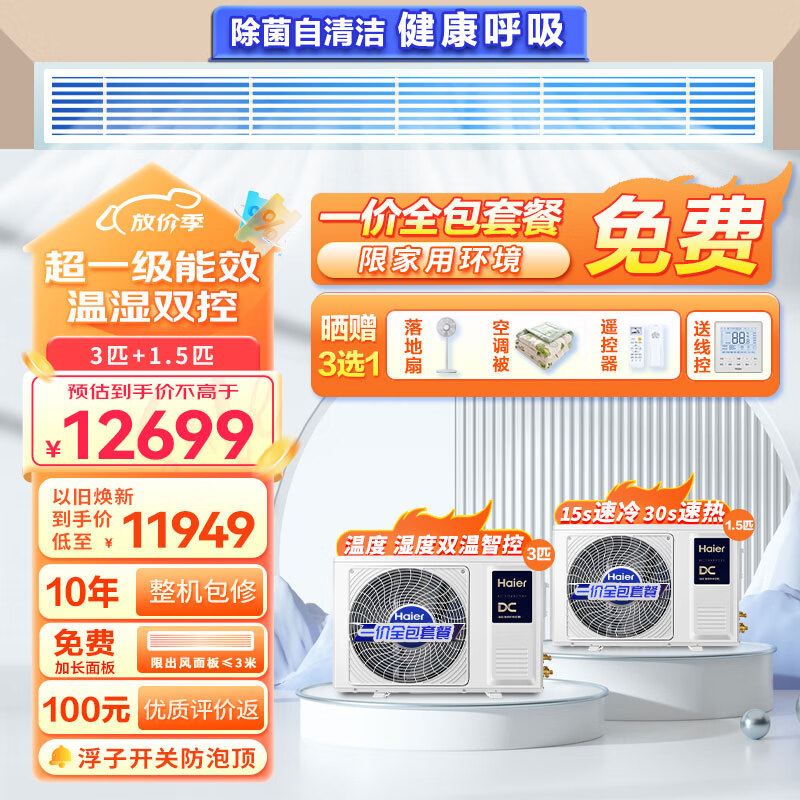 海尔(Haier)中央空调风管机一拖一 组合套餐3匹+1.5匹新一级能效 云舒 全直流变频 KFRd-72NW/72ECD81价格:12699.00元!