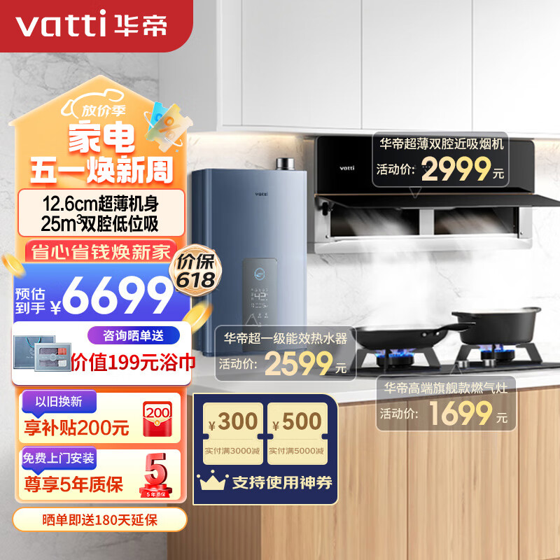 华帝(VATTI)抽油烟机变频超薄近吸双腔25风量油烟机灶具热水器家用厨房多件套i11210+76B+254-16(天然气)价格:6699.00元!