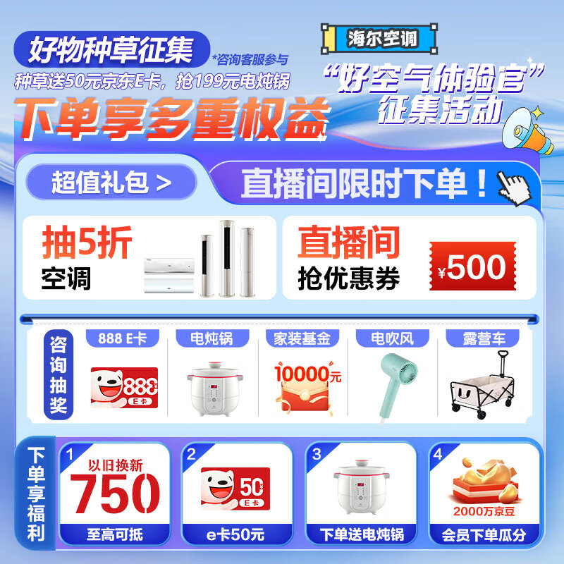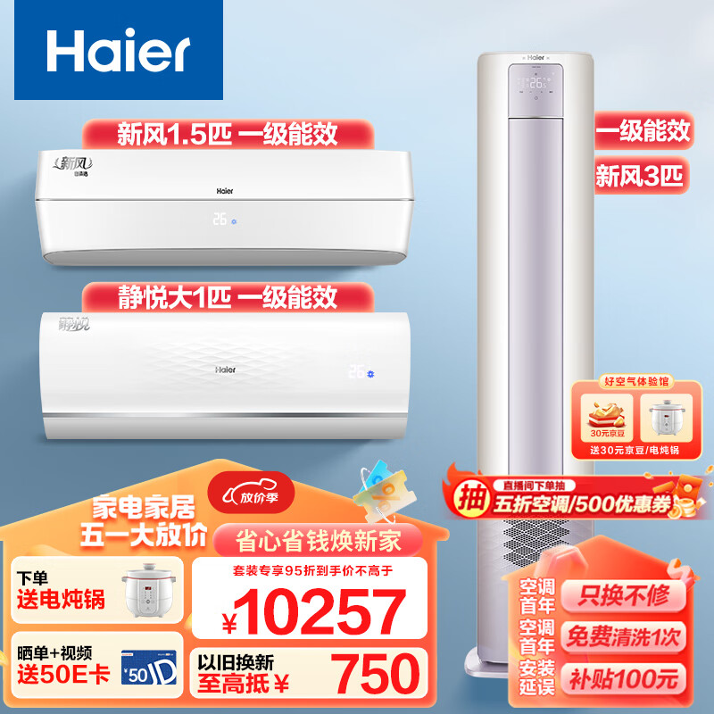 海尔(Haier) 新一级能效两室一厅套装新风空调套装(大1匹静悦一级挂机+1.5匹新风挂机+3匹新风柜机)以旧换新价格:10257.00元!