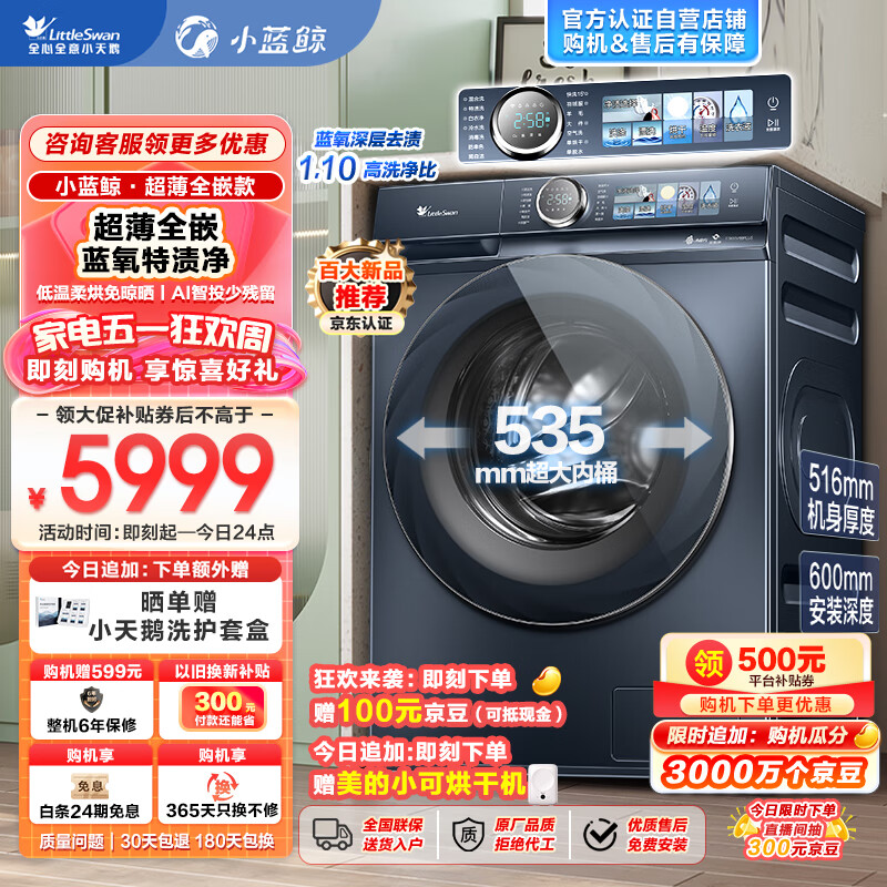 小天鹅(LittleSwan)滚筒洗衣机全自动【小蓝鲸TD100V88PLUS】洗烘一体机 超薄全嵌 本色蓝氧特渍净 护色水魔方 10公斤价格:6099.00元!