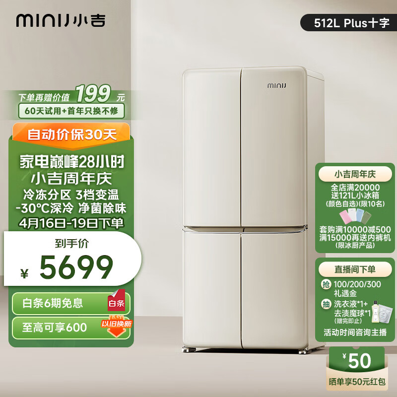 小吉512L双变频风冷无霜一级能效超薄十字对开门嵌入式客厅冰箱干湿分储低噪BCD-JS512Plus价格:5819.00元!