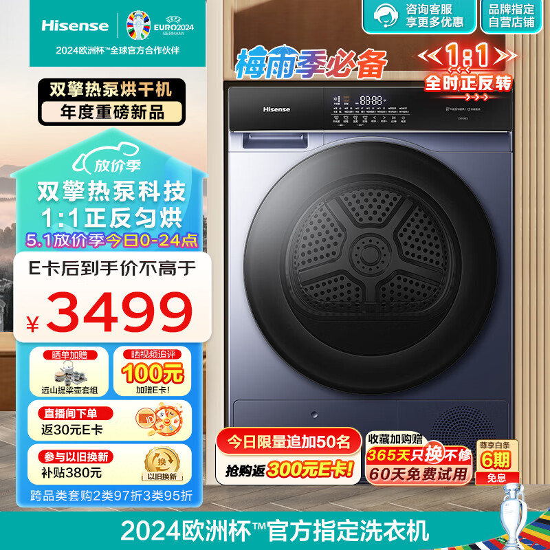 海信(Hisense)SE烘干机家用 10公斤双擎热泵干衣机 1:1正反转 羊绒烘 梅雨季必备 大风量柔烘 DG10SE3以旧换新价格:3799.00元!