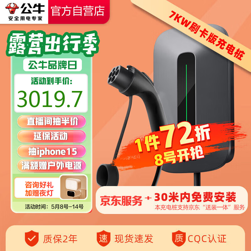 公牛新能源汽车交流充电桩适配于小米su7汽车比亚迪极氪特斯拉问界小鹏理想蔚来 7KW刷卡款 30米安装价格:4194.00元!