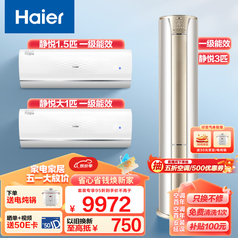 海尔(Haier)空调 套装二室一厅(大1匹静悦一级挂机+1.5匹静悦一级挂机+3匹静悦一级能效柜机)套购价格:9972.00元!