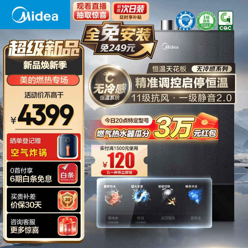 美的(Midea)16升燃气热水器 天然气 一级静音2.0 一级恒温水伺服 下置风机 零冷水 无冷感热水器 JSQ30-GQ16S7价格:4399.00元!