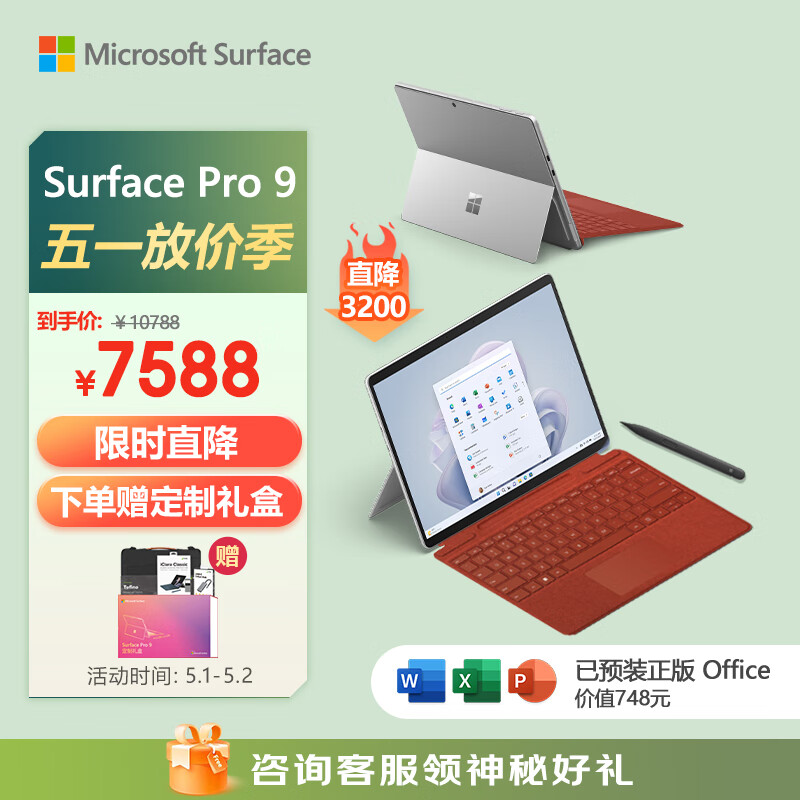 微软Surface Pro 9 亮铂金+波比红带触控笔键盘盖 i5 8G+256G 二合一学生电脑 13英寸120Hz 平板笔记本价格:7588.00元!