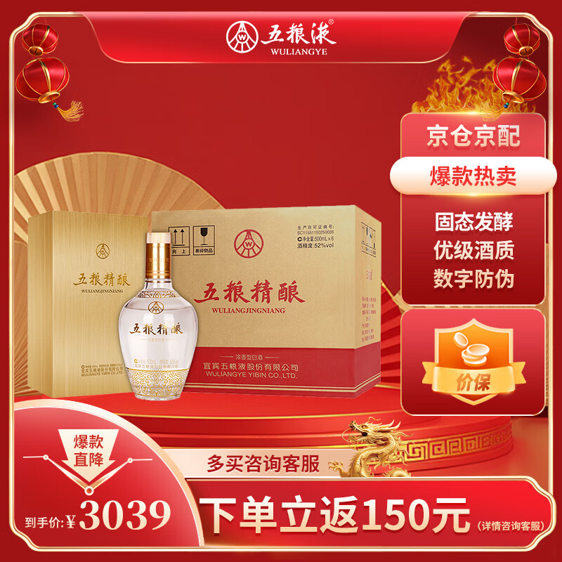 五粮液股份 五粮精酿 拉丝金 浓香型白酒 52度 500ml*6瓶 整箱 送礼宴饮价格:3039.00元!