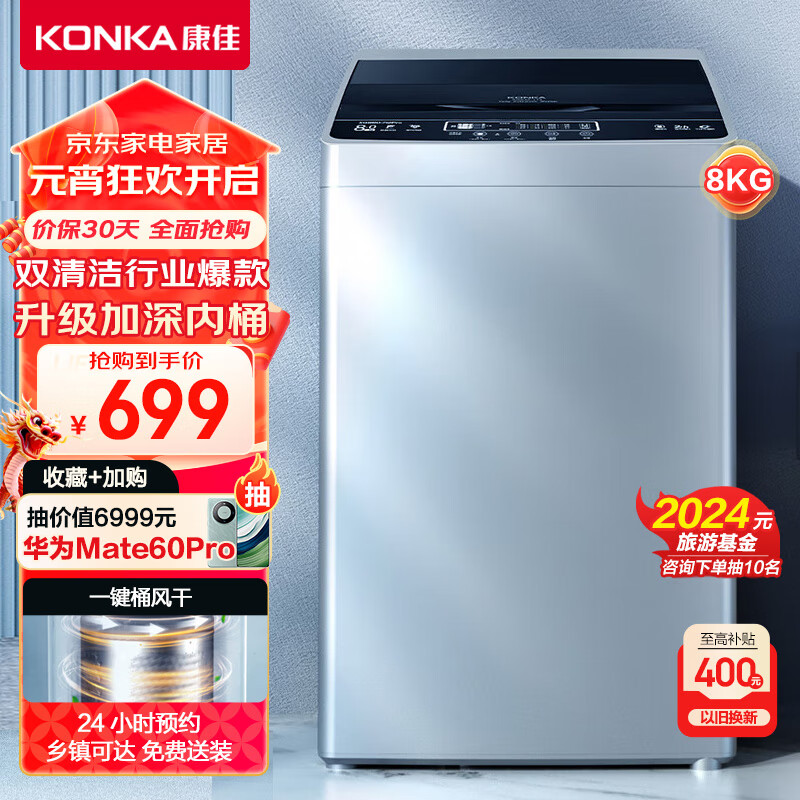 康佳 8KG 大容量全自动波轮小型洗衣机 租房神器 21分钟快洗 一键脱水 桶自洁风干XQB80-712价格:699.00元!