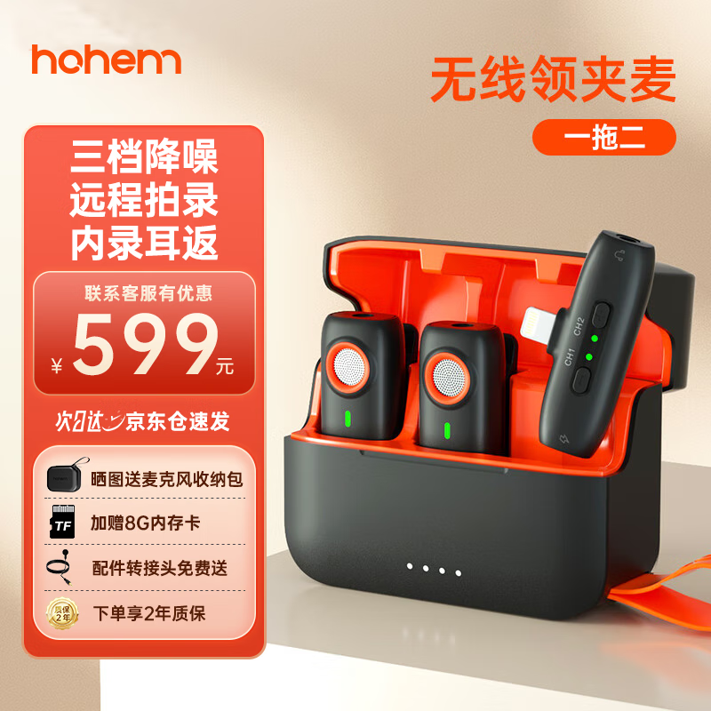 浩瀚(hohem) Mic-01无线领夹麦克风一拖二直播话筒收音麦讲解器手机K歌设备主播短视频单反录音价格:599.00元!