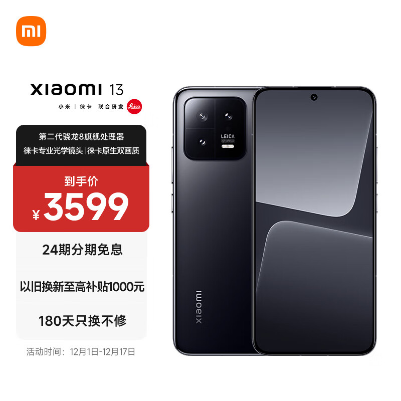 小米13 徕卡光学镜头 第二代骁龙8处理器 超窄边屏幕 120Hz高刷 67W快充 8+256GB 黑色 5G手机价格:3599.00元!