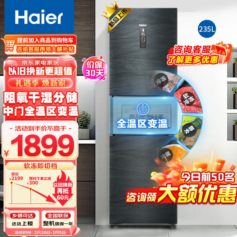 海尔(Haier)235升风冷无霜三门冰箱 中门全温区变温 阻氧干湿分储 一级能效智能双变频价格:1899.00元!