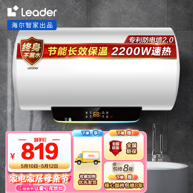 海尔智家出品Leader 80升电热水器家用洗澡储水式 安心浴系列 小尺寸易安装节能 LES80H-LT价格:819.00元!