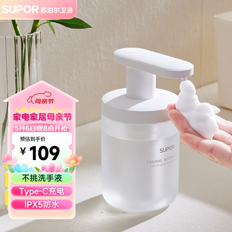 苏泊尔自动感应泡沫洗手机 免接触洗手液出泡机免打孔皂液器IPX5充电款价格:109.00元!