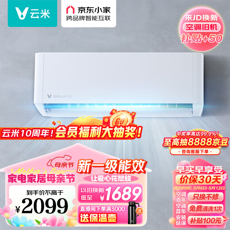 云米 (VIOMI)京东小家智能生态 大1匹 iCool 2S 爱酷 新一级变频冷暖 空调挂机KFRd-26GW/Y4PP2-A1价格:2099.00元!