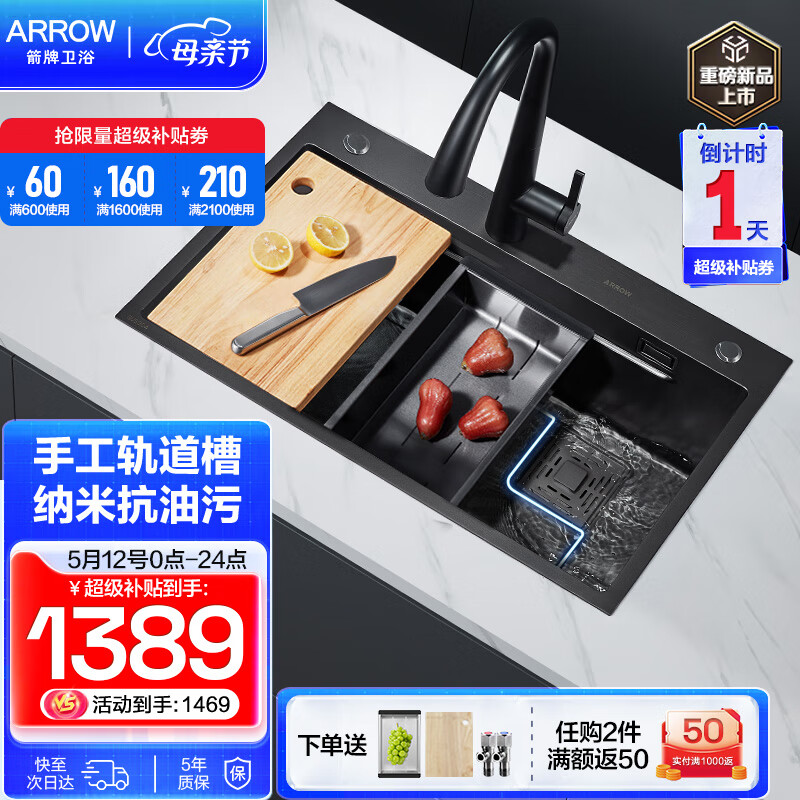 箭牌(ARROW)304不锈钢水槽手工纳米轨道大单槽厨房洗菜盆洗菜池洗碗一体盆 75黑手工纳米轨道槽-含抽拉龙头价格:1769.00元!