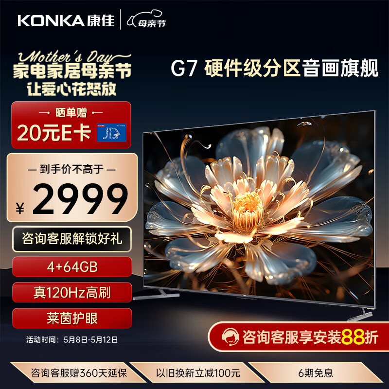 康佳电视 65G7 65英寸 百级分区背光 120Hz MEMC 4+64GB 4K超清屏智能液晶平板游戏电视机以旧换新价格:2899.00元!