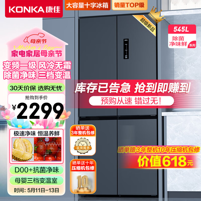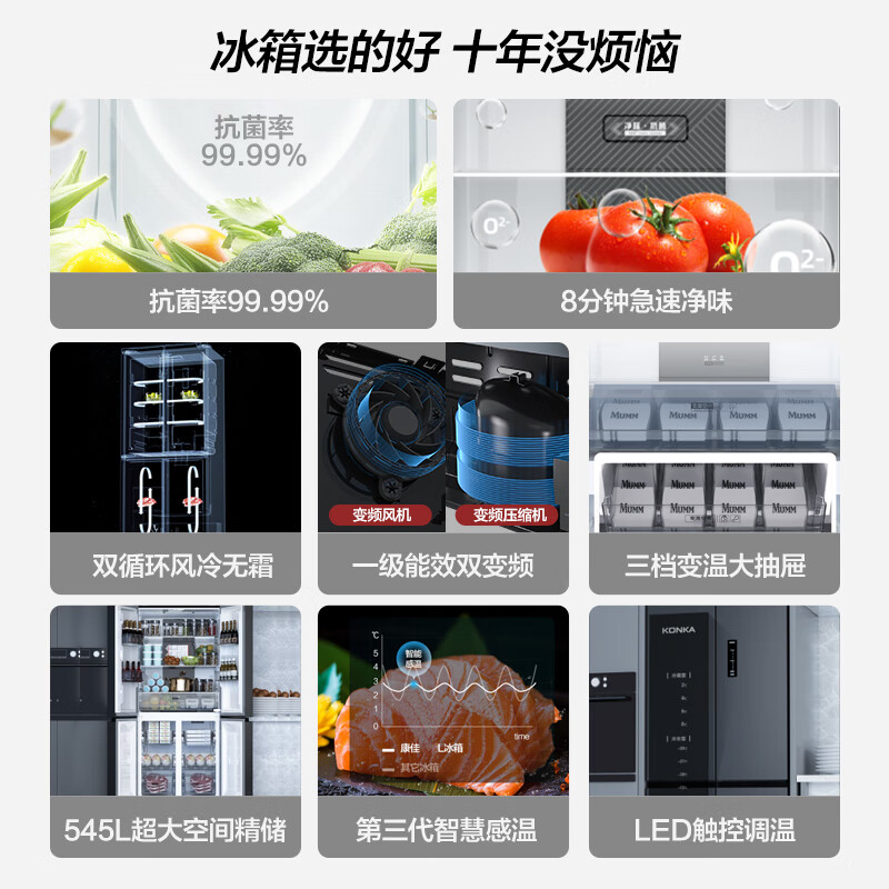 康佳545升双变频一级能效无霜双循环除菌净味母婴专属空间十字对开双开四开门电冰箱BCD-545WEGQ4SP价格:2299.00元!