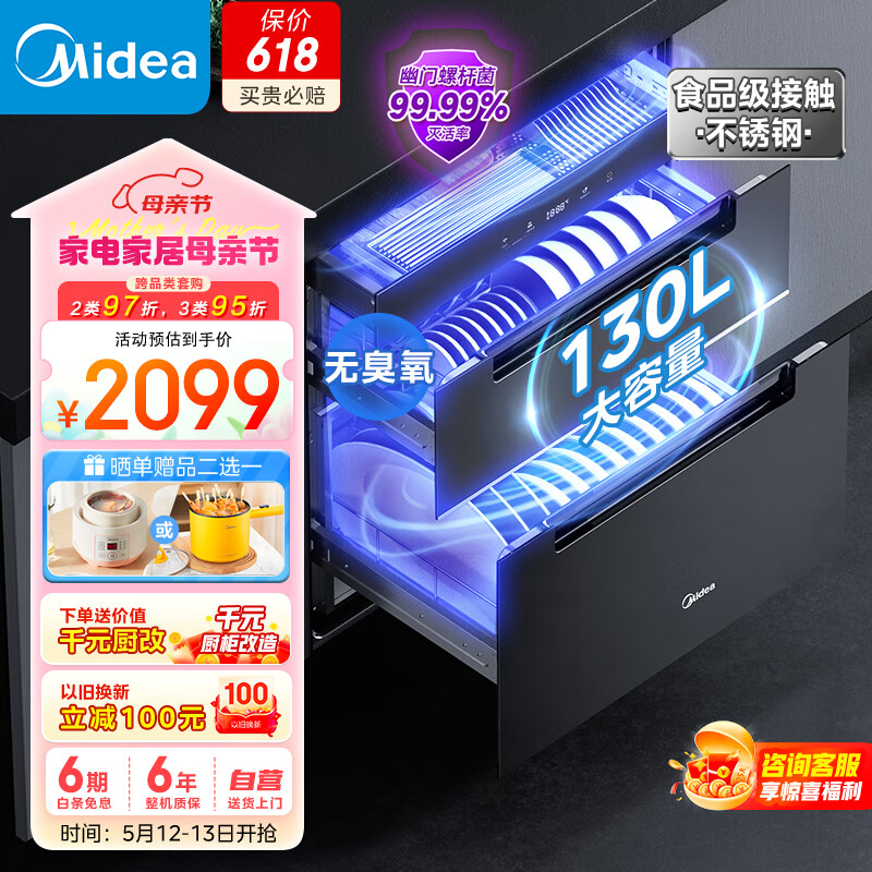 美的(Midea)消毒柜嵌入式家用 厨房餐具碗柜碗筷茶杯茶具 紫外线 二星 婴儿奶瓶 130L三层大容量130HQ3价格:2099.00元!