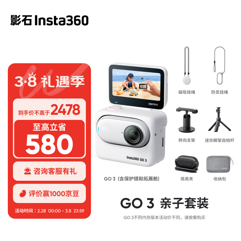 Insta360影石 GO 3拇指相机 运动亲子Vlog骑行宠物防水防抖运动相机(亲子套装 灵动白128G版)价格:2478.00元!