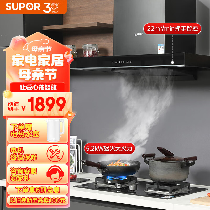 苏泊尔(SUPOR) 抽油烟机 烟灶套装22立方家用欧式吸油烟机燃气灶具套装挥手智控 自清洁 DT32+DB2Z7S液价格:2049.00元!