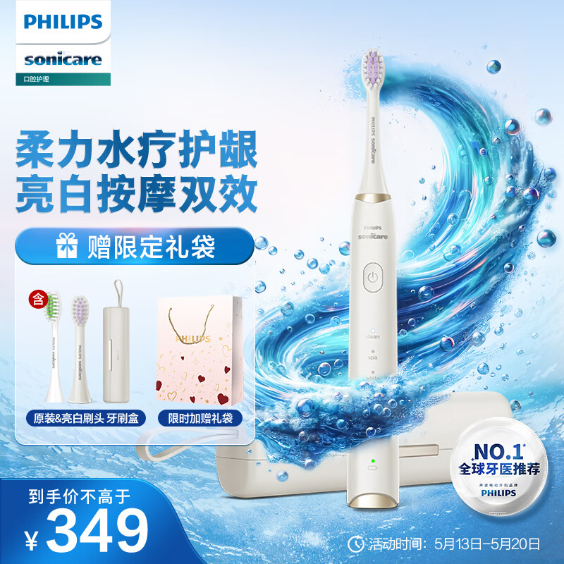 飞利浦(PHILIPS)电动牙刷成人 520情侣送男/女友 母亲节礼物 S5 SPA刷HX2491/01白色声波震动清洁亮白护龈5种模式价格:399.00元!