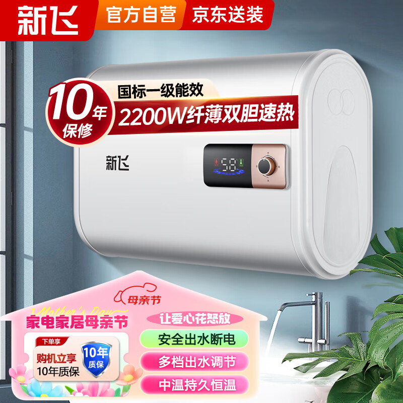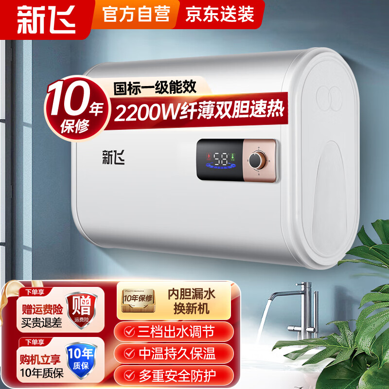 新飞储水式电热水器扁桶40升一级能效2200W节能出水断电双胆速热家用卫生间洗澡恒温租房DSZF-B208-40L价格:498.90元!