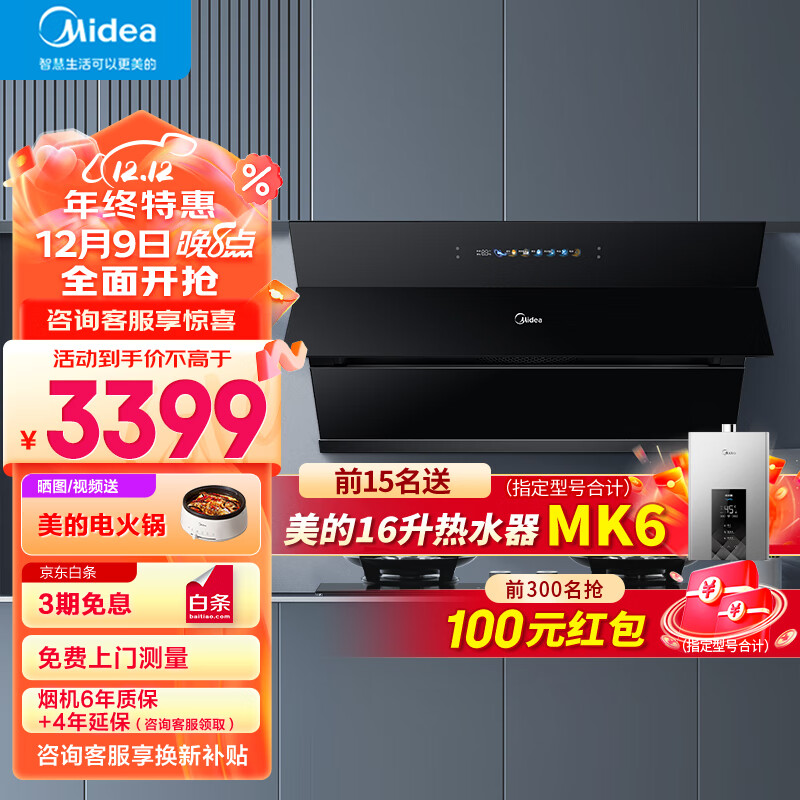 美的(Midea)抽油烟机5.2kW燃气灶家用侧吸23风量变频烟灶联动水洗 烟灶套装JP70+Q529天然气价格:3399.00元!