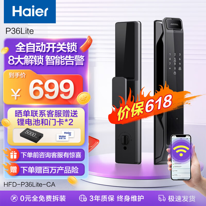 海尔智能门锁P36Lite指纹锁全自动防盗门锁密码锁电子门锁指纹智能锁 全自动门锁【标准锁体】价格:899.00元!