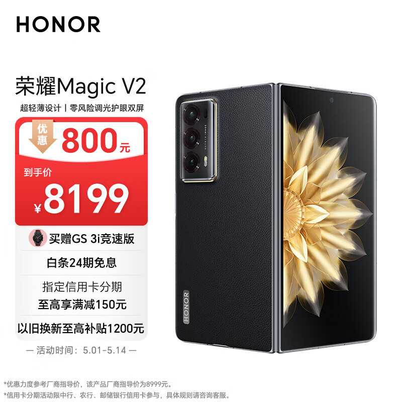 荣耀Magic V2 折叠屏 9.9mm超轻薄 零风险调光护眼双屏 5000mAh青海湖电池 5G AI手机 16+256 雅黑色价格:8999.00元!