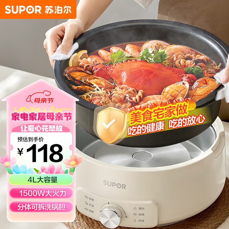 苏泊尔(SUPOR)电火锅 电煮锅 火锅专用锅 家用多功能涮肉锅 不粘分体可拆洗4L电热锅 多用途锅H28YK857价格:118.00元!
